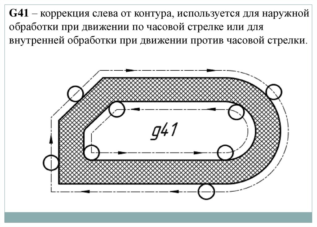 G41 – коррекция слева от контура, используется для наружнойобработки при движении по часовой стрелке или для