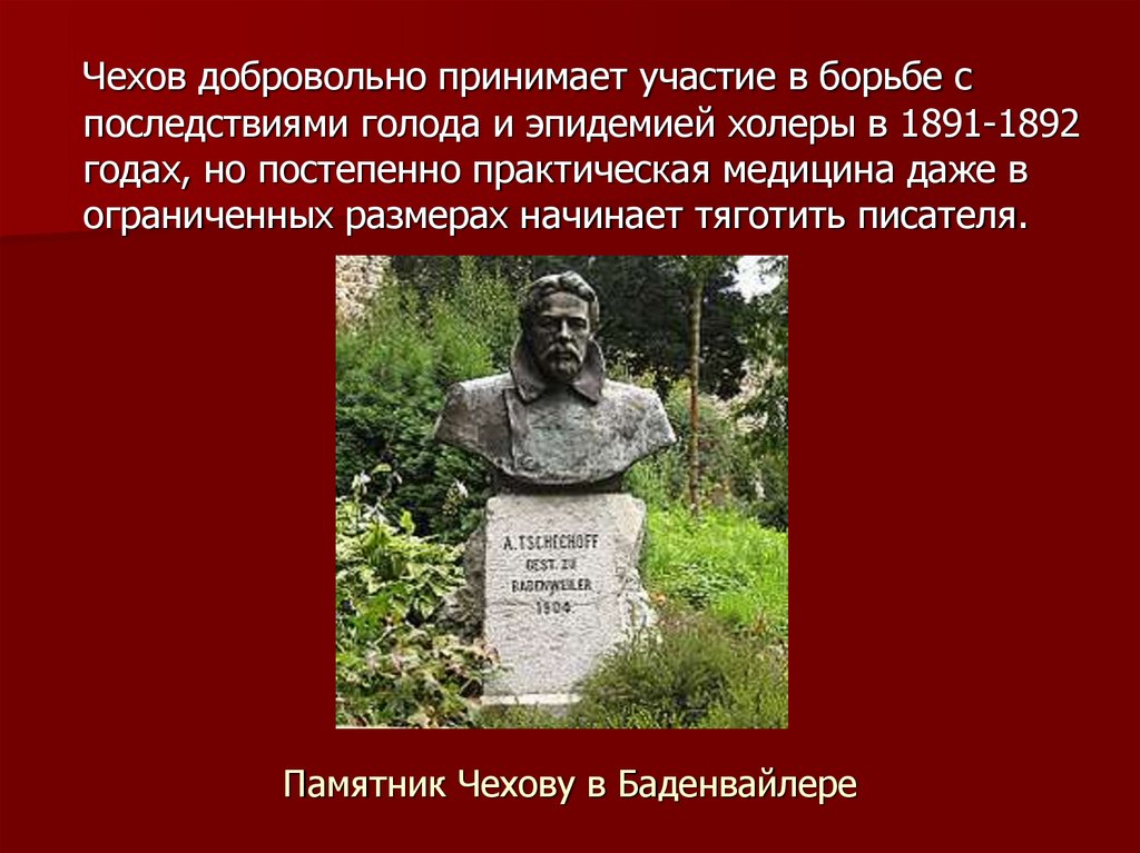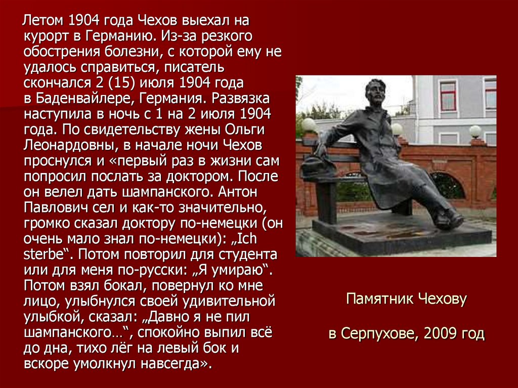 Летом 1904 года Чехов выехал накурорт в Германию. Из-за резкого