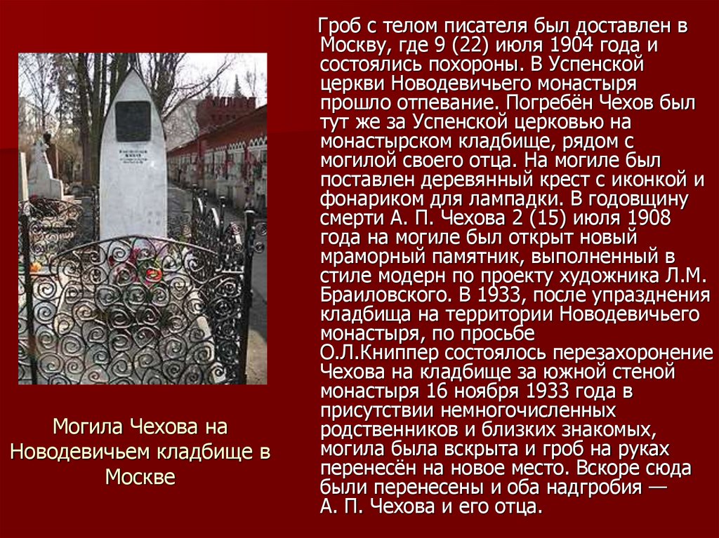 Гроб с телом писателя был доставлен вМоскву, где 9 (22) июля 1904 года и