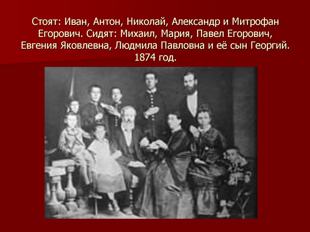 6. Стоят: Иван, Антон, Николай, Александр и Митрофан Егорович. Сидят: Михаил, Мария, Павел Егорович, Евгения Яковлевна, Людмила