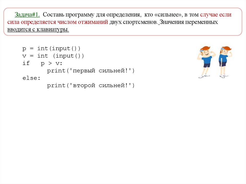 Задача#1. Составь программу для определения, кто «сильнее», в том случае еслисила определяется числом отжиманий двух спортсменов. Значения переменных