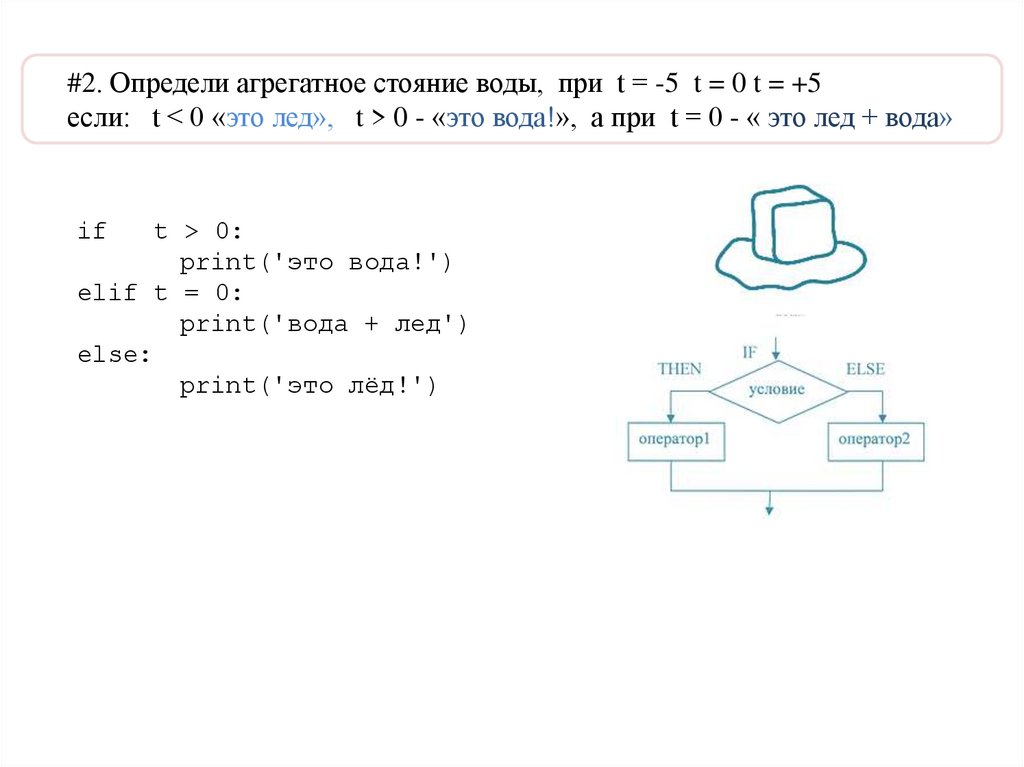 #2. Определи агрегатное стояние воды, при t = -5 t = 0 t = +5если: t < 0 «это лед», t > 0 - «это вода!», а при t = 0 - « это лед + вода»
