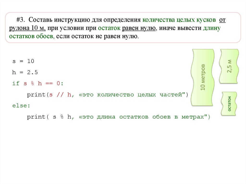 рулона 10 м, при условии при остаток равен нулю, иначе вывести длину