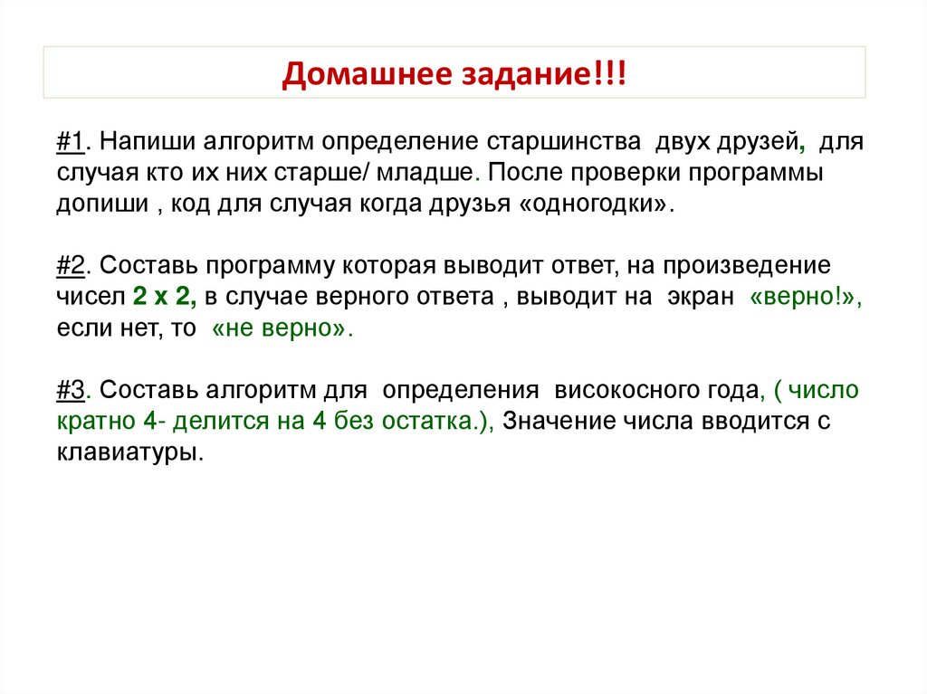 Домашнее задание!!!#1. Напиши алгоритм определение старшинства двух друзей, для