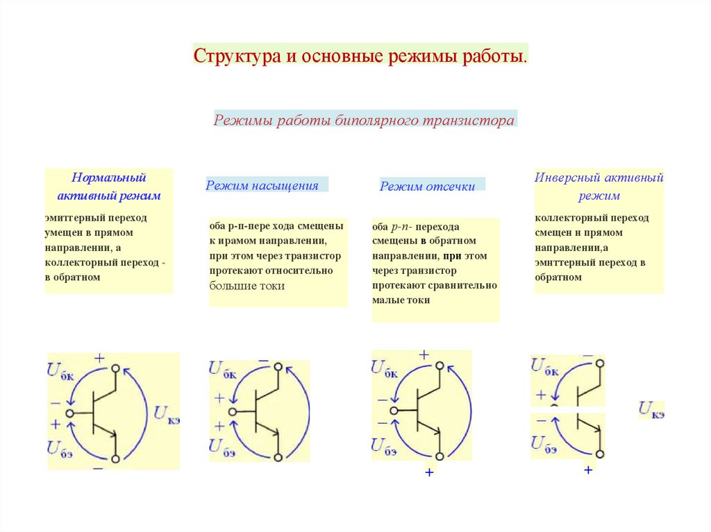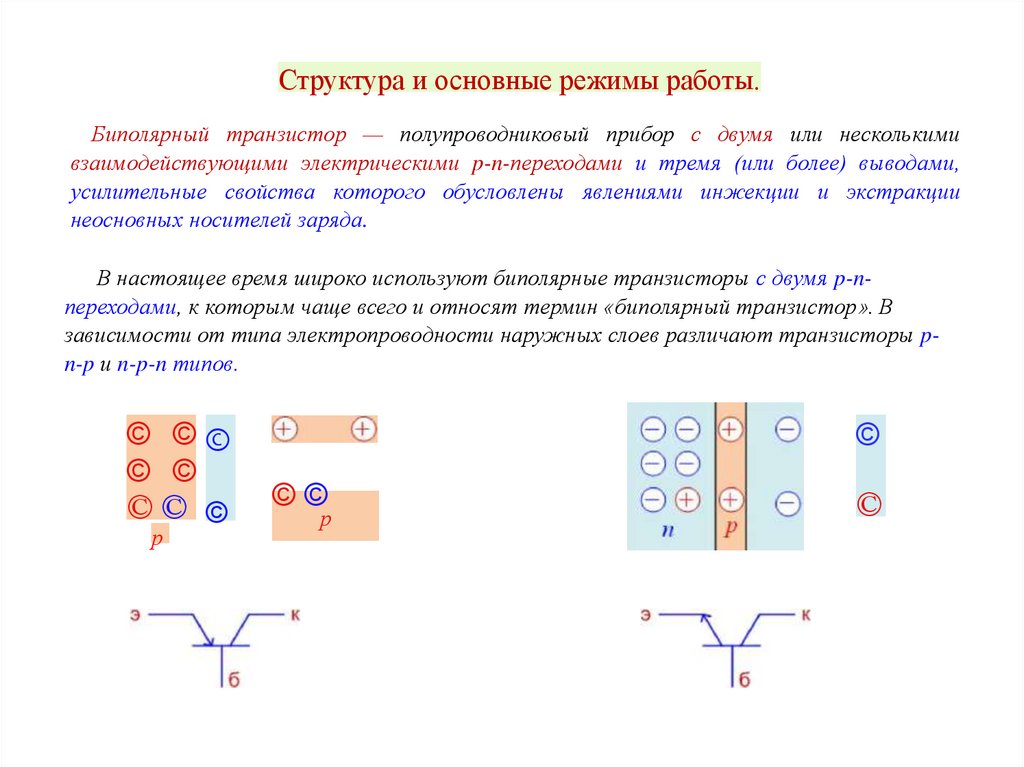 Структура и основные режимы работы.Биполярный транзистор — полупроводниковый прибор с двумя или несколькими