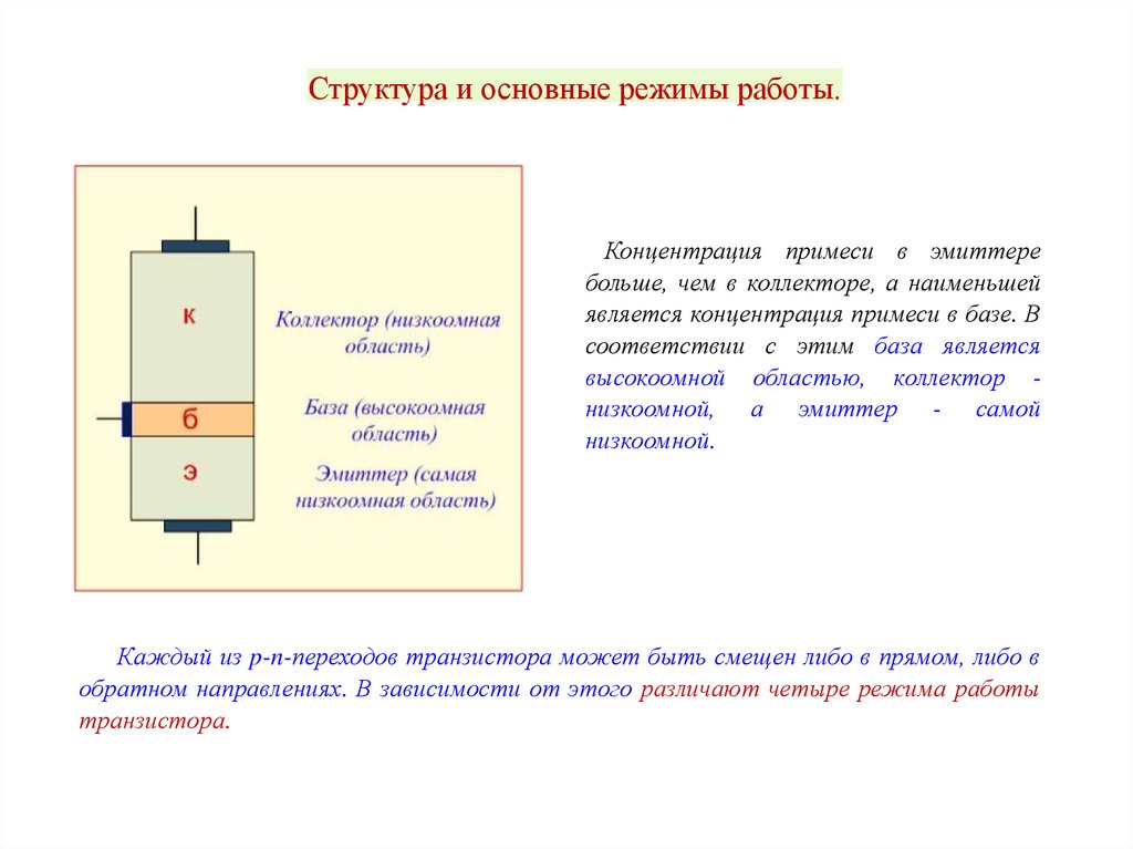 Структура и основные режимы работы.Концентрация примеси в эмиттере