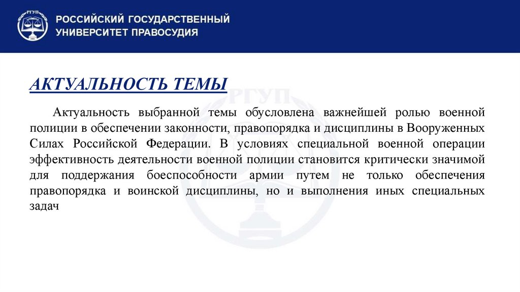 Актуальность выбранной темы обусловлена важнейшей ролью военнойполиции в обеспечении законности, правопорядка и дисциплины в Вооруженных