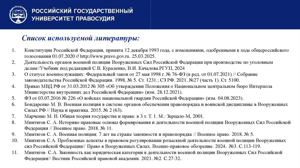Минтягов С. А. Военная полиция: 7 лет на страже законности и правопорядка // Военное право. 2018. № 5.
