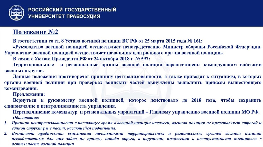 Положение №2В соответствии со ст. 8 Устава военной полиции ВС РФ от 25 марта 2015 года № 161: