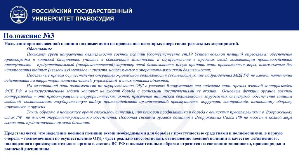 полноценного правоохранительного органа в составе ВС РФ и положительным образом отразится на состоянии законности, правопорядка и