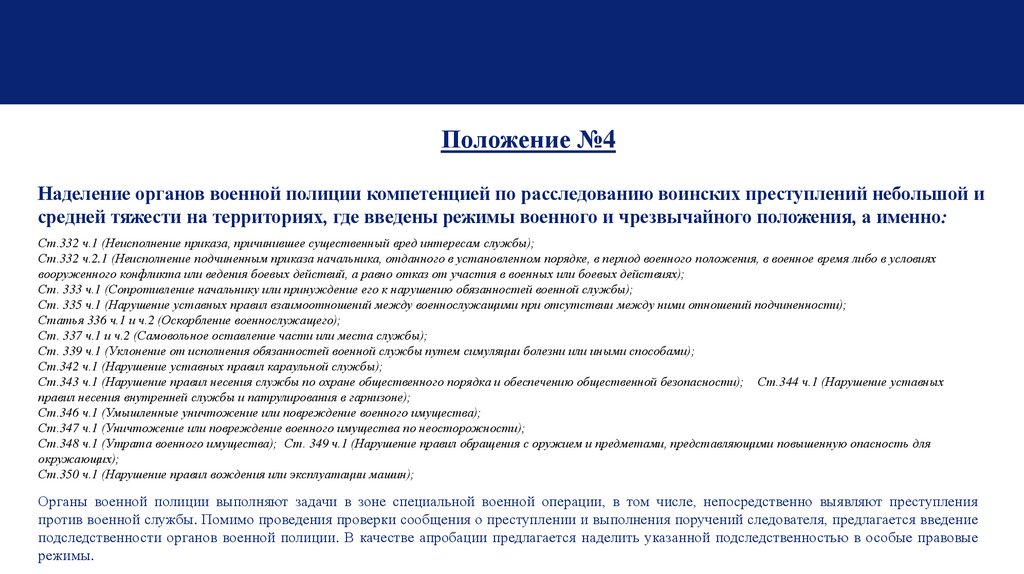 Наделение органов военной полиции компетенцией по расследованию воинских преступлений небольшой исредней тяжести на территориях, где введены режимы военного и чрезвычайного положения, а именно: