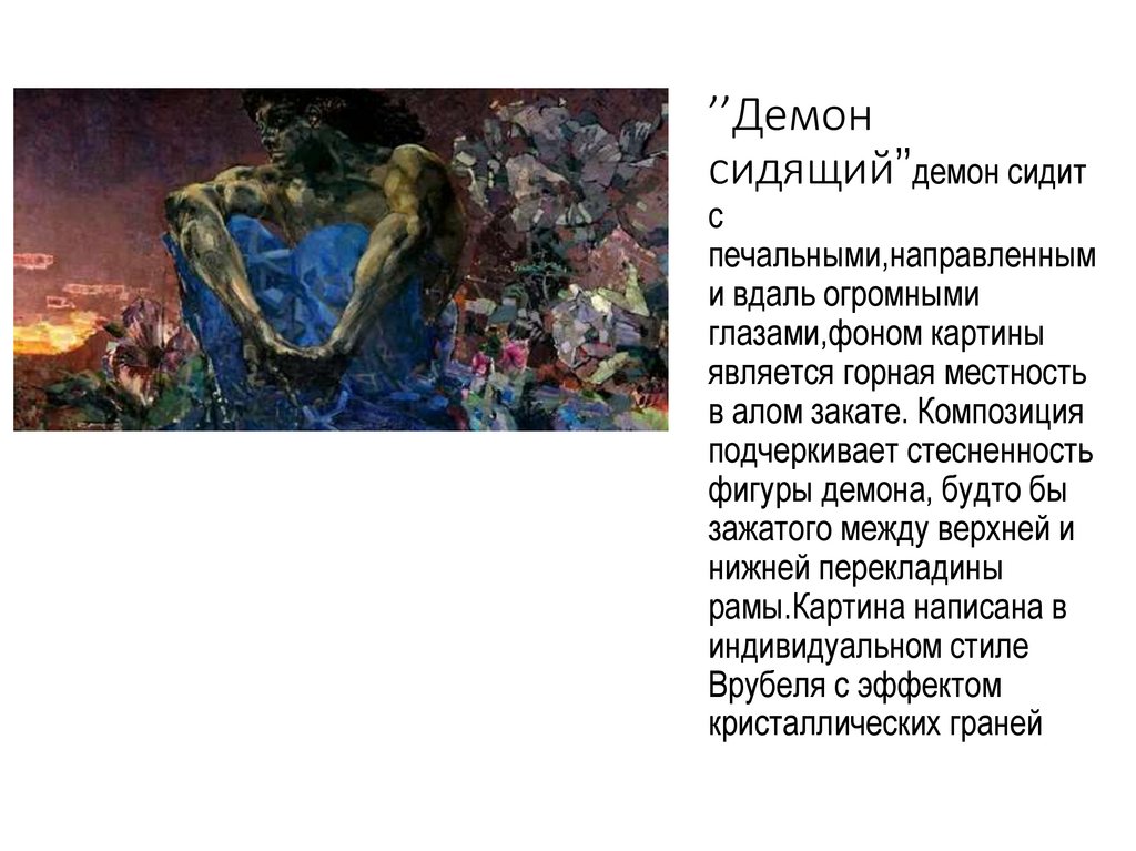 5. ’’Демон сидящий’’демон сидит с печальными,направленными вдаль огромными глазами,фоном картины является горная местность в алом