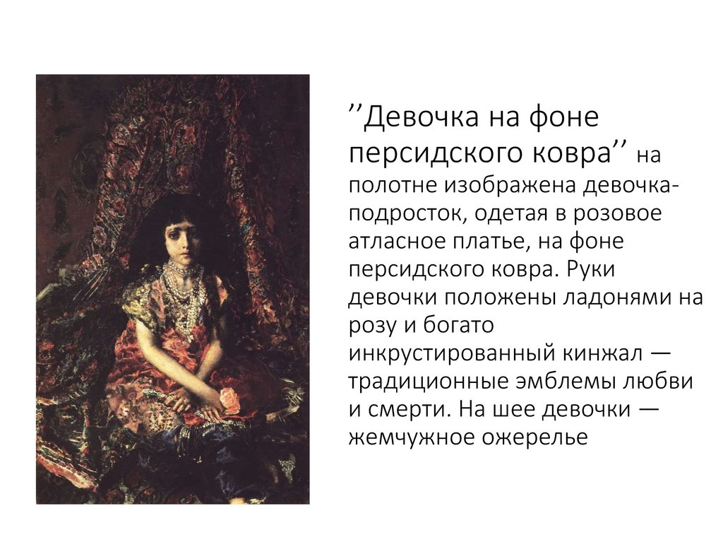 6. ’’Девочка на фоне персидского ковра’’ на полотне изображена девочка-подросток, одетая в розовое атласное платье, на фоне