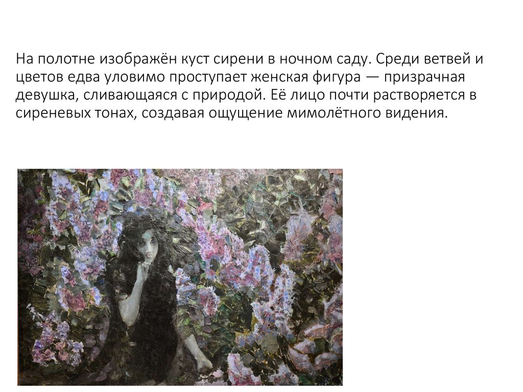 7. На полотне изображён куст сирени в ночном саду. Среди ветвей и цветов едва уловимо проступает женская фигура — призрачная