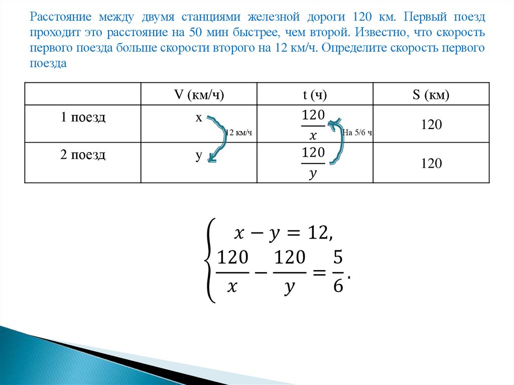 Расстояние между двумя станциями железной дороги 120 км. Первый поездпроходит это расстояние на 50 мин быстрее, чем второй. Известно, что скорость