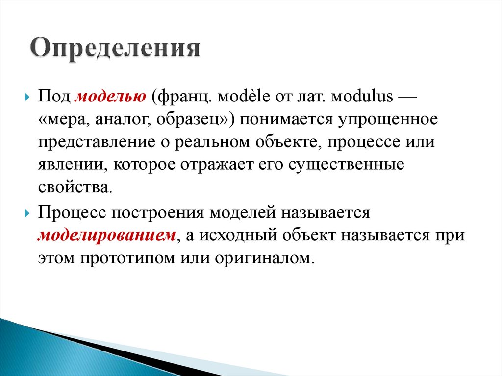 Под моделью (франц. мodèle от лат. мodulus —«мера, аналог, образец») понимается упрощенное