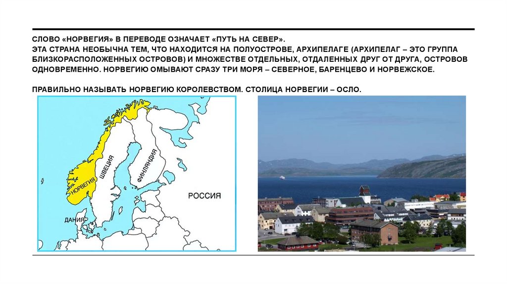 СЛОВО «НОРВЕГИЯ» В ПЕРЕВОДЕ ОЗНАЧАЕТ «ПУТЬ НА СЕВЕР».ЭТА СТРАНА НЕОБЫЧНА ТЕМ, ЧТО НАХОДИТСЯ НА ПОЛУОСТРОВЕ, АРХИПЕЛАГЕ (АРХИПЕЛАГ – ЭТО ГРУППА