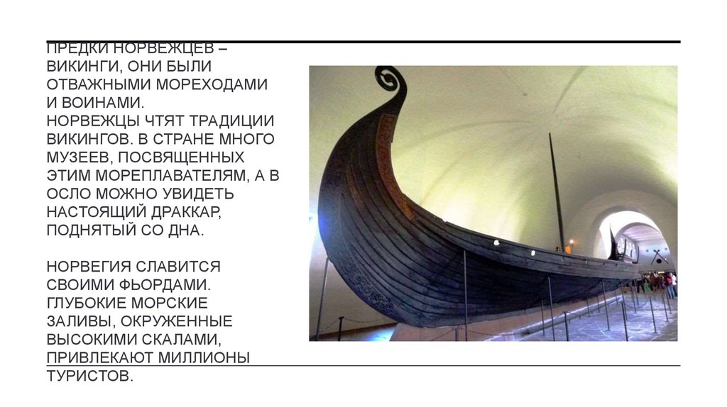 4. ПРЕДКИ НОРВЕЖЦЕВ – ВИКИНГИ, ОНИ БЫЛИ ОТВАЖНЫМИ МОРЕХОДАМИ И ВОИНАМИ. Норвежцы чтят традиции викингов. В стране много музеев,