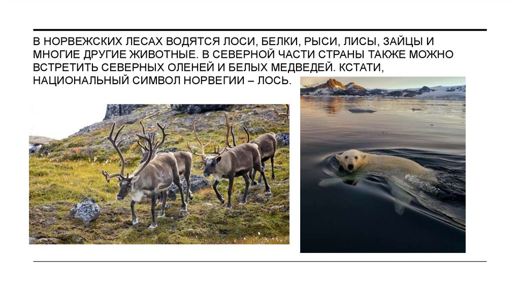 7. В НОРВЕЖСКИХ ЛЕСАХ ВОДЯТСЯ ЛОСИ, БЕЛКИ, РЫСИ, ЛИСЫ, ЗАЙЦЫ И МНОГИЕ ДРУГИЕ ЖИВОТНЫЕ. В СЕВЕРНОЙ ЧАСТИ СТРАНЫ ТАКЖЕ МОЖНО