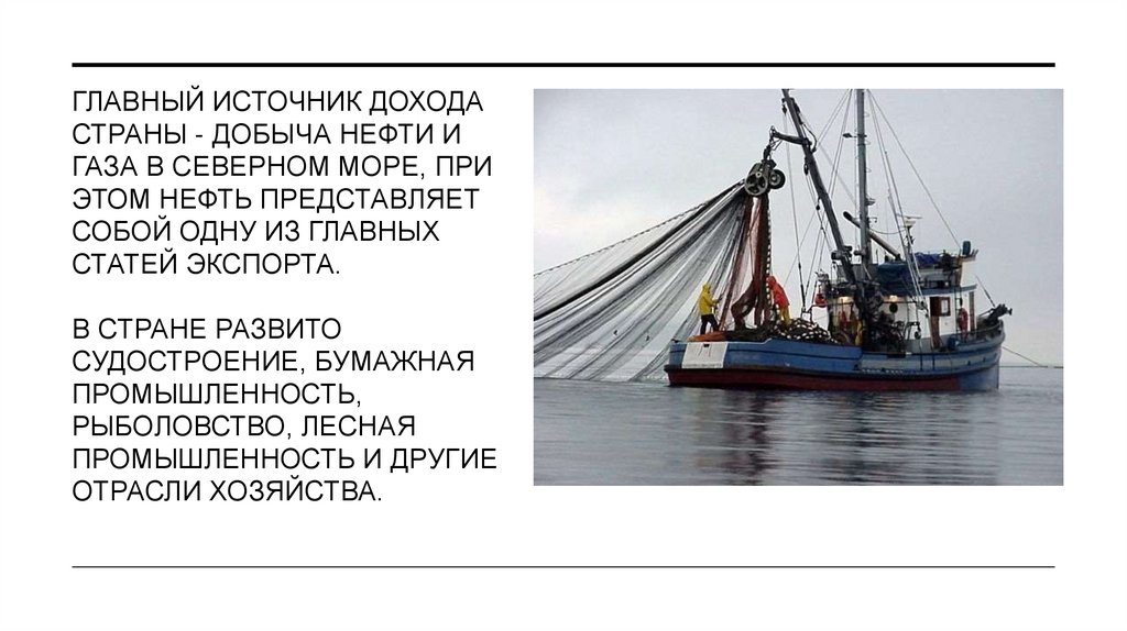 9. Главный источник ДОХОДА СТРАНЫ - добыча нефти и газа в Северном море, ПРИ ЭТОМ нефть представляет собой одну из главных статей