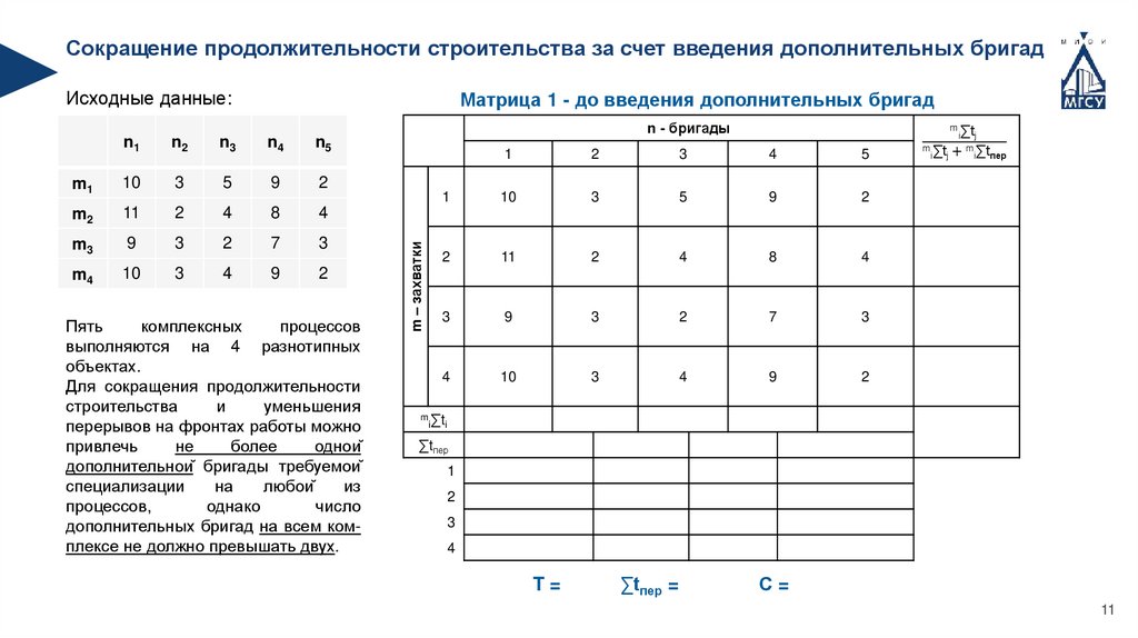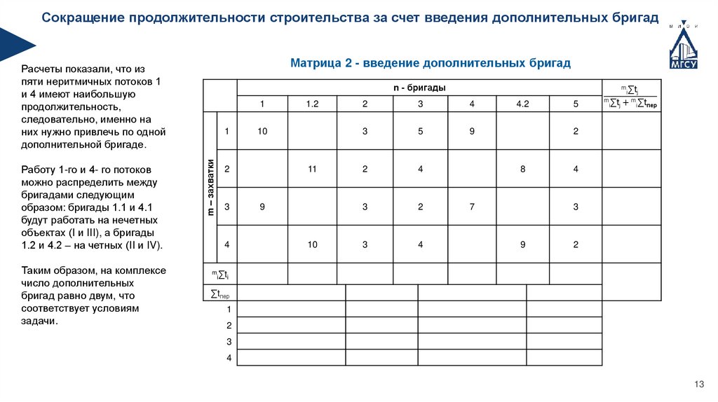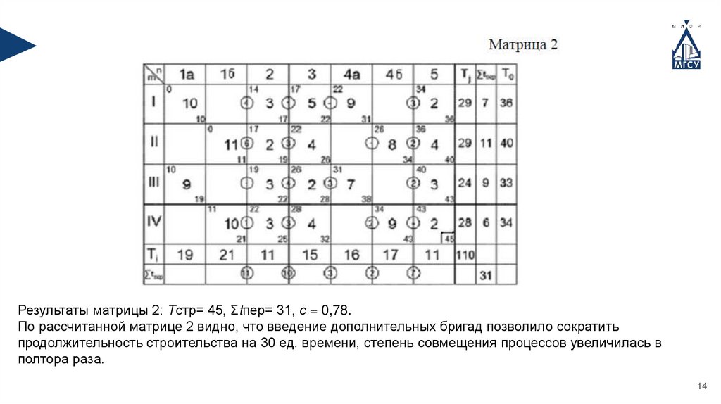 Результаты матрицы 2: Тстр= 45, Σtпер= 31, с = 0,78.По рассчитанной матрице 2 видно, что введение дополнительных бригад позволило сократить