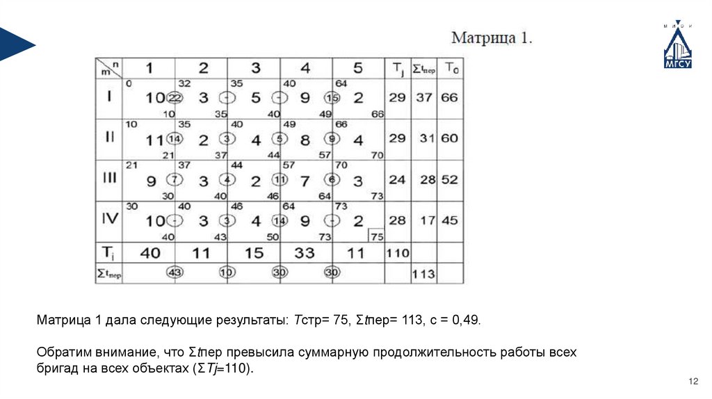 Матрица 1 дала следующие результаты: Тстр= 75, Σtпер= 113, с = 0,49.Обратим внимание, что Σtпер превысила суммарную продолжительность работы всех