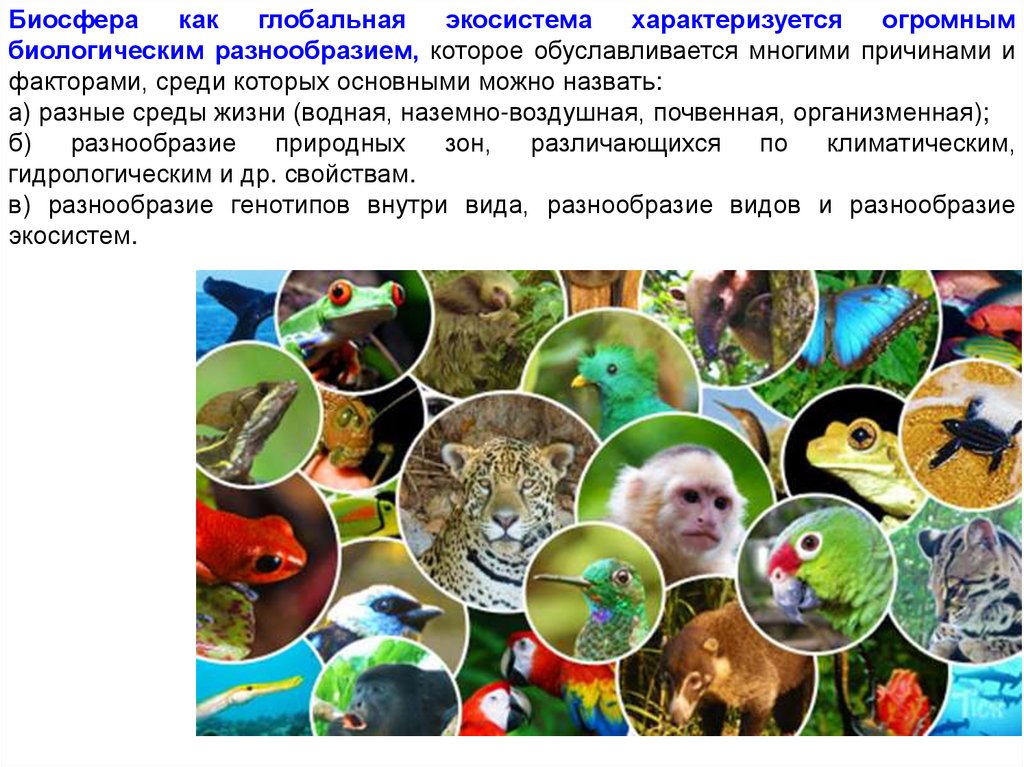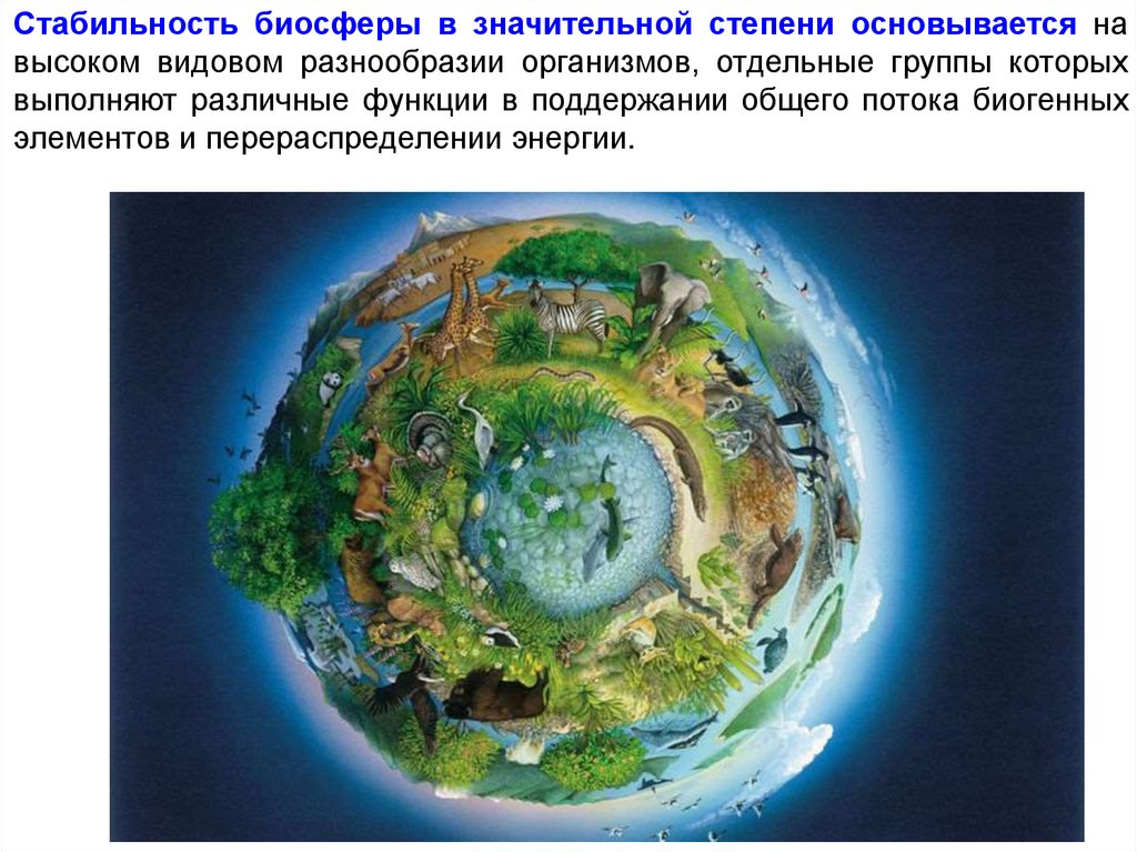 Стабильность биосферы в значительной степени основывается навысоком видовом разнообразии организмов, отдельные группы которых