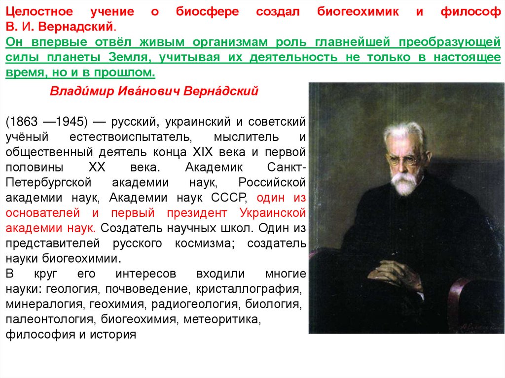 Целостное учение о биосфере создал биогеохимик и философВ. И. Вернадский.