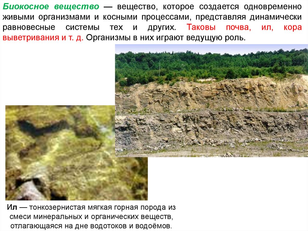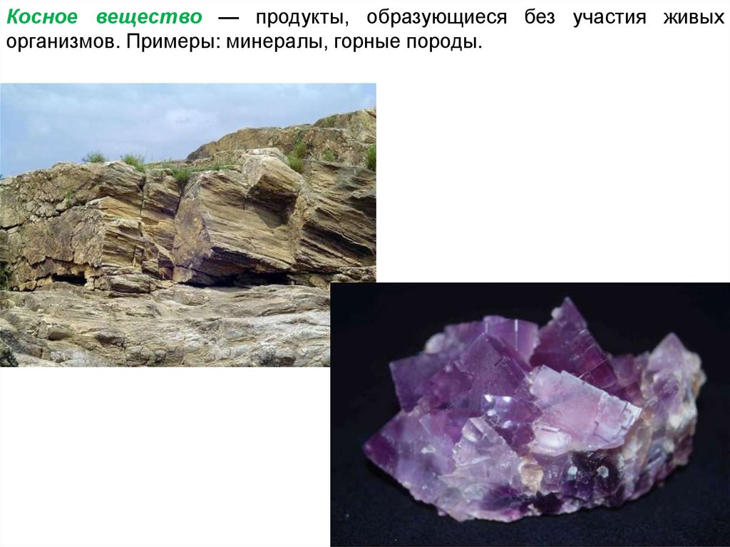 Косное вещество — продукты, образующиеся без участия живыхорганизмов. Примеры: минералы, горные породы.
