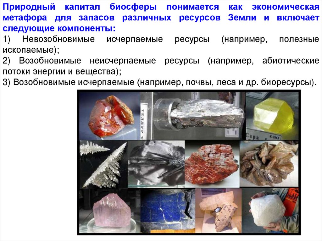 Природный капитал биосферы понимается как экономическаяметафора для запасов различных ресурсов Земли и включает