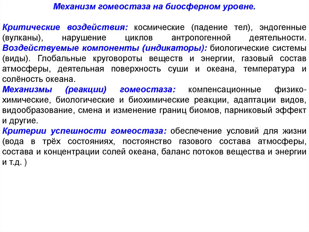 Механизм гомеостаза на биосферном уровне.Критические воздействия: космические (падение тел), эндогенные