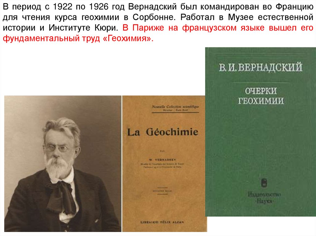 В период с 1922 по 1926 год Вернадский был командирован во Франциюдля чтения курса геохимии в Сорбонне. Работал в Музее естественной