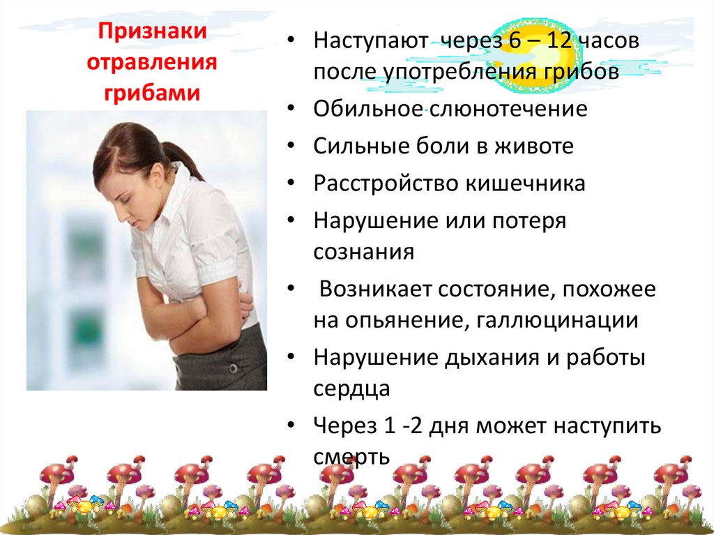 • Наступают через 6 – 12 часовпосле употребления грибов