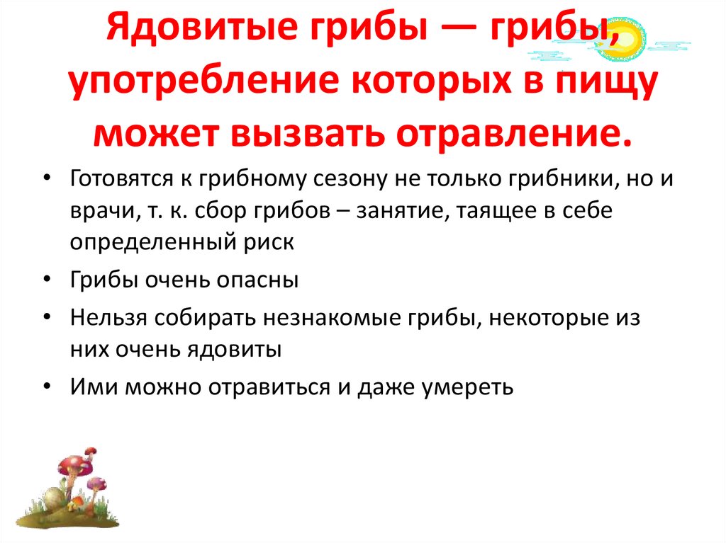 • Готовятся к грибному сезону не только грибники, но иврачи, т. к. сбор грибов – занятие, таящее в себе