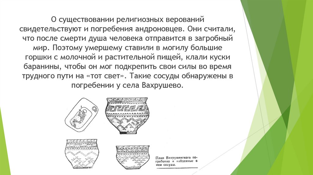 О существовании религиозных верованийсвидетельствуют и погребения андроновцев. Они считали,