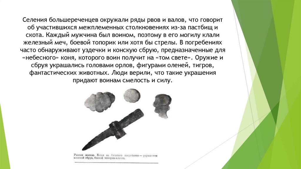 железный меч, боевой топорик или хотя бы стрелы. В погребениях