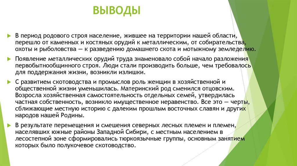 В период родового строя население, жившее на территории нашей области,перешло от каменных и костяных орудий к металлическим, от собирательства,
