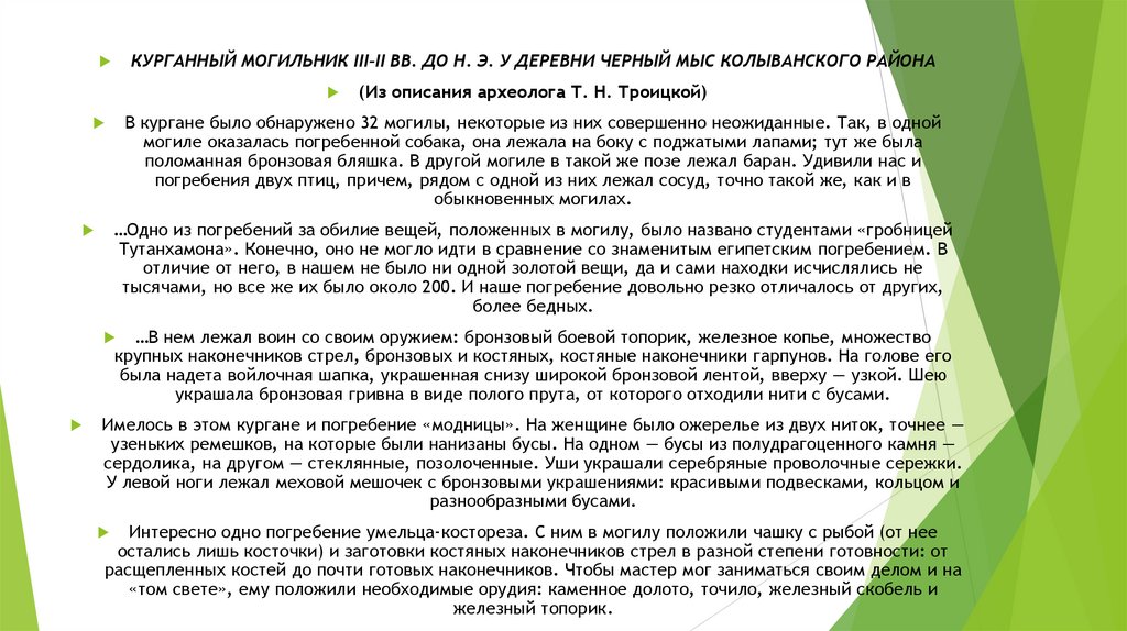 КУРГАННЫЙ МОГИЛЬНИК III-II ВВ. ДО H. Э. У ДЕРЕВНИ ЧЕРНЫЙ МЫС КОЛЫВАНСКОГО РАЙОНА(Из описания археолога Т. Н. Троицкой)