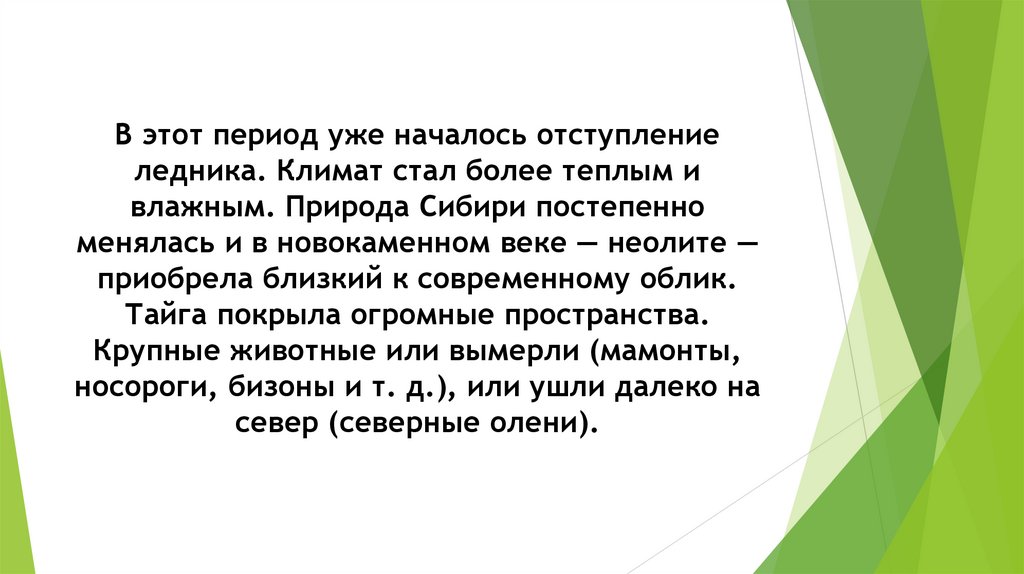 В этот период уже началось отступлениеледника. Климат стал более теплым и