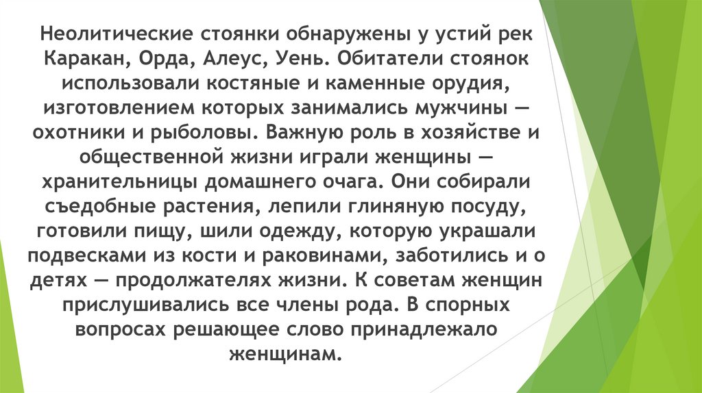 Неолитические стоянки обнаружены у устий рекКаракан, Орда, Алеус, Уень. Обитатели стоянок