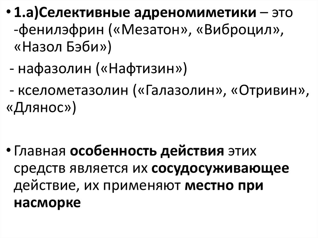 • 1.а)Селективные адреномиметики – это-фенилэфрин («Мезатон», «Виброцил»,
