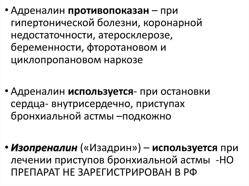 • Адреналин противопоказан – пригипертонической болезни, коронарной