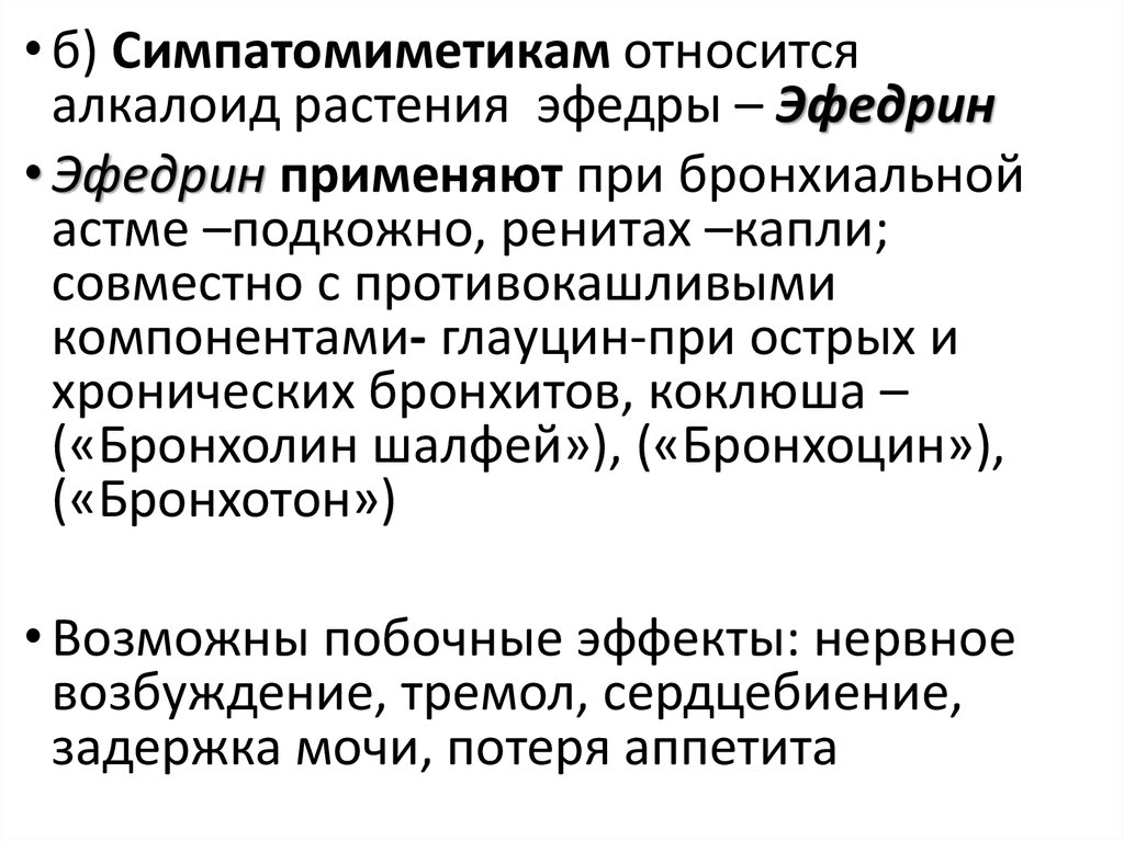 • б) Симпатомиметикам относитсяалкалоид растения эфедры – Эфедрин