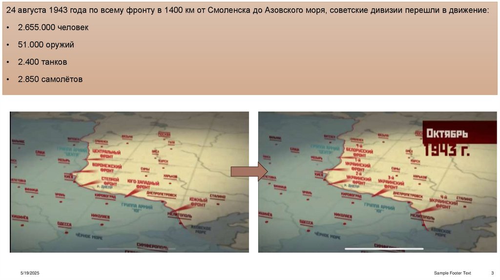 24 августа 1943 года по всему фронту в 1400 км от Смоленска до Азовского моря, советские дивизии перешли в движение:2.655.000 человек