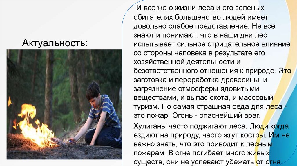 туризм. Но самая страшная беда для леса это пожар. Огонь - опаснейший враг.