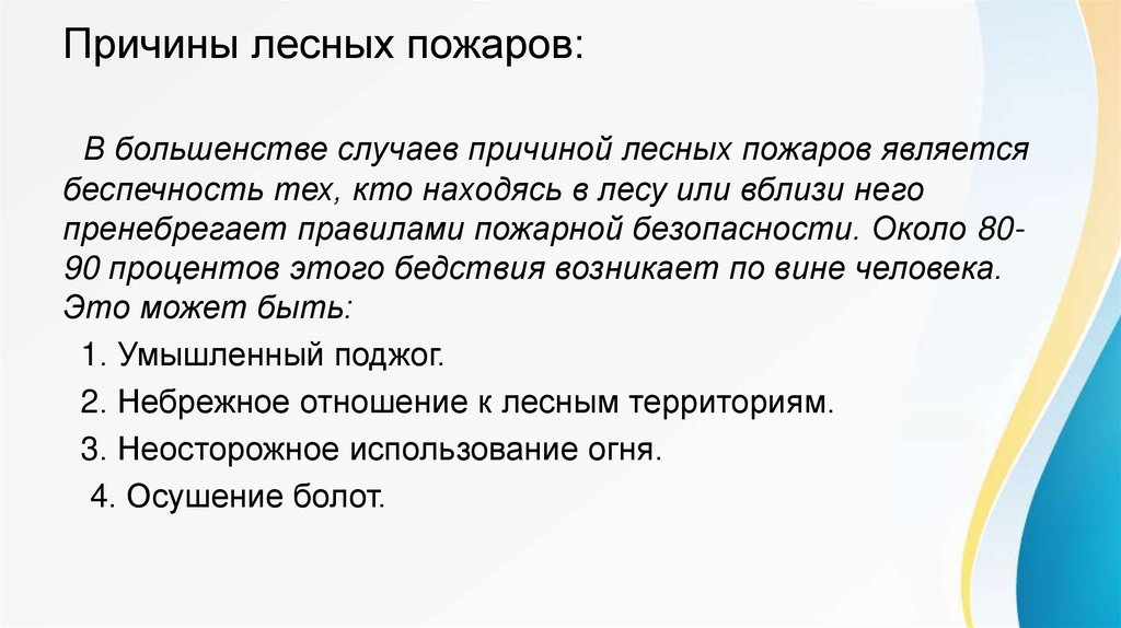 Причины лесных пожаров:В большенстве случаев причиной лесных пожаров является