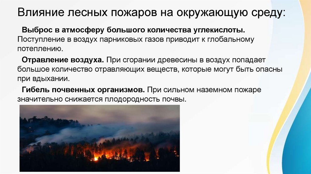 Влияние лесных пожаров на окружающую среду:Выброс в атмосферу большого количества углекислоты.