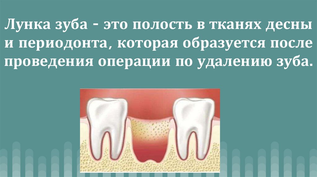 Лунка зуба - это полость в тканях десныи периодонта, которая образуется после