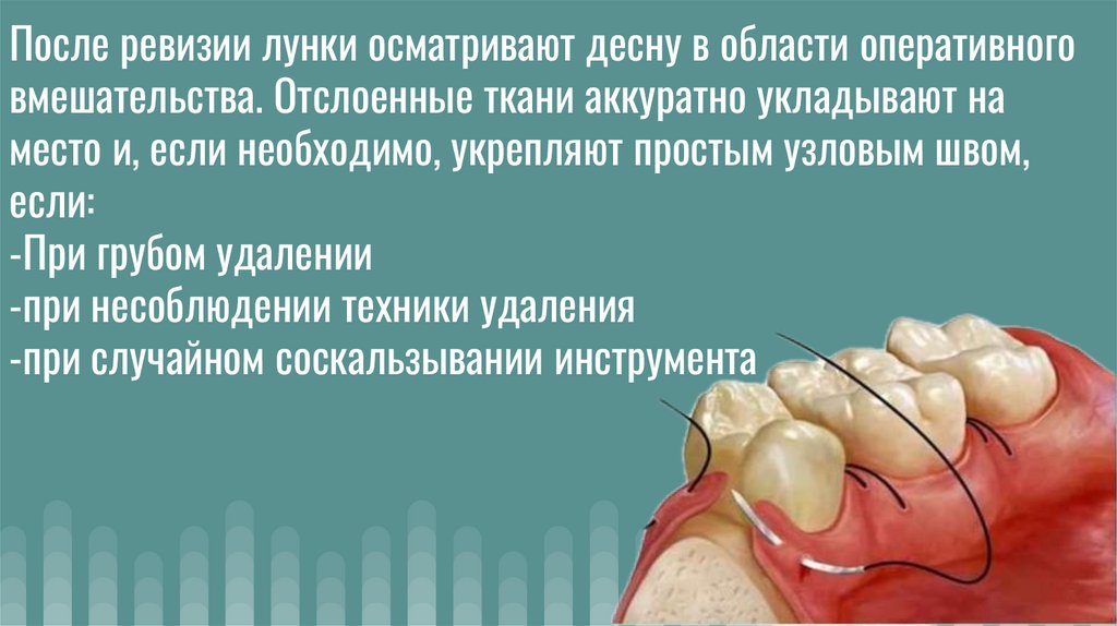 После ревизии лунки осматривают десну в области оперативноговмешательства. Отслоенные ткани аккуратно укладывают на
