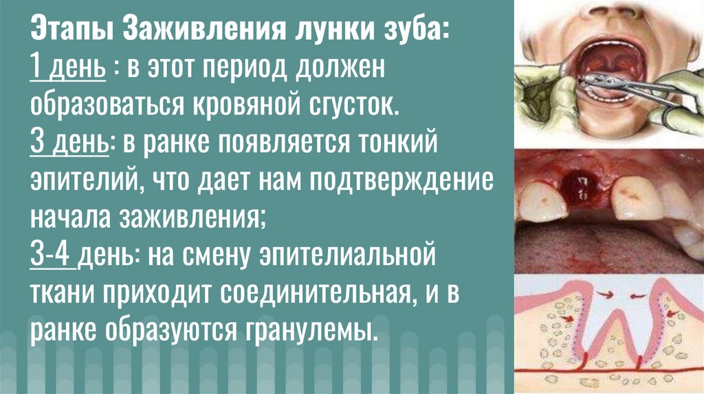 Этапы Заживления лунки зуба:1 день : в этот период должен